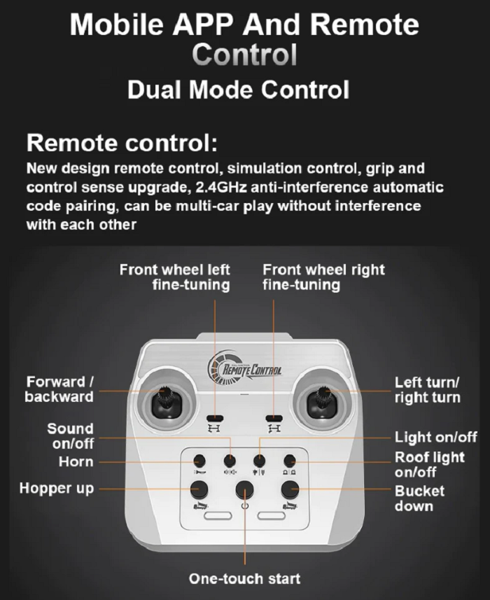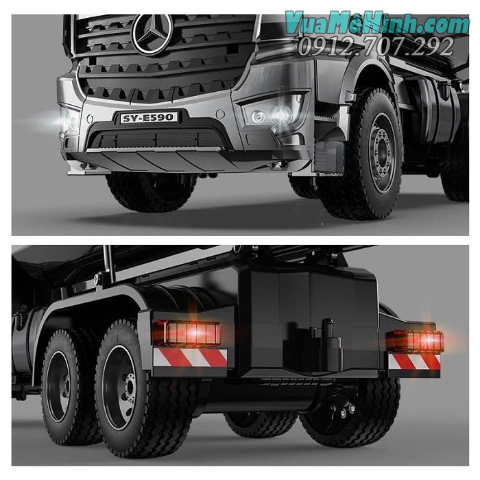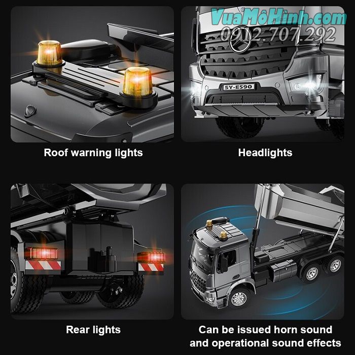Ngoài ra, mô hình điều khiển Mercedes-Benz Arocs Dump Truck E590 còn được trang bị các tính năng đặc biệt như hệ thống đèn LED chiếu sáng, âm thanh phát ra từ loa trên bộ điều khiển, khả năng đổ và nâng hạ thùng xe đổ đất và khả năng điều khiển hướng đi và tốc độ của xe từ xa.