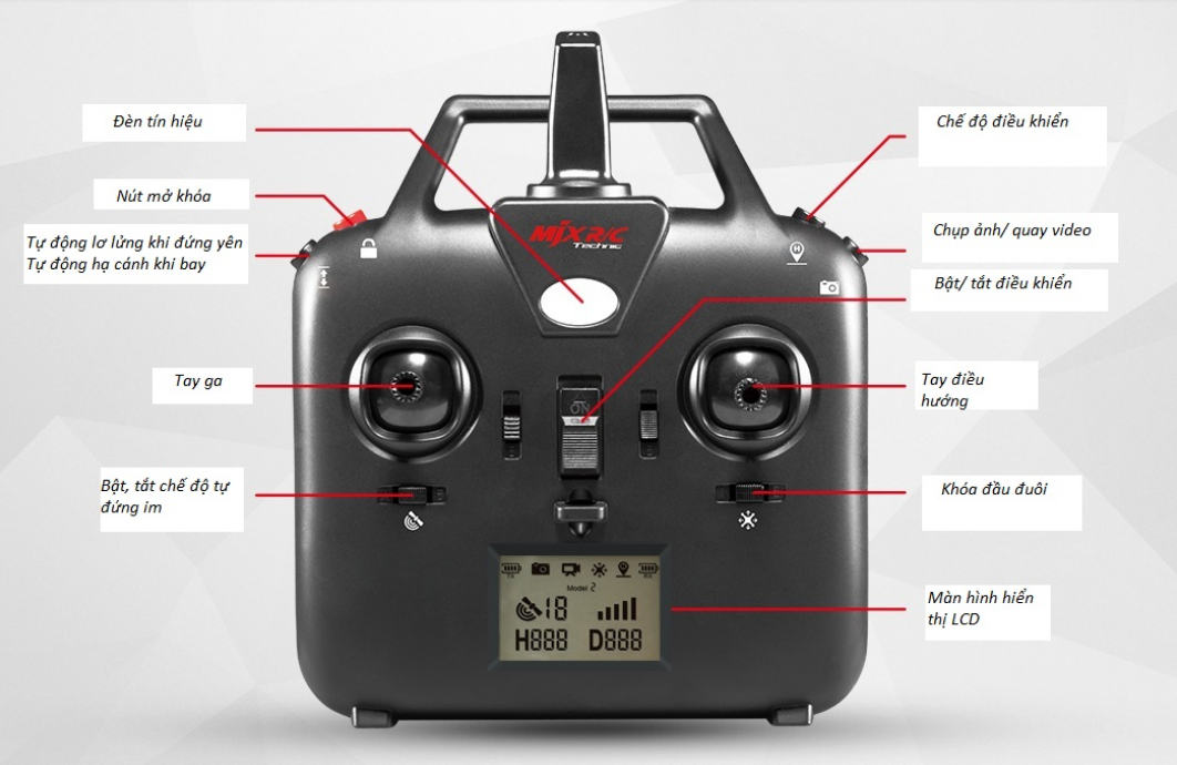 - Ấn nút đỏ 1 lần để mở khóa, lúc này cánh quạt sẽ bắt đầu quay ( chú ý: động cơ máy bay rất mạnh, đứng cách xa máy bay, gạt tay ga lên nhẹ nhàng, khi đạt đủ độ cao máy bay sẽ ổn định ).