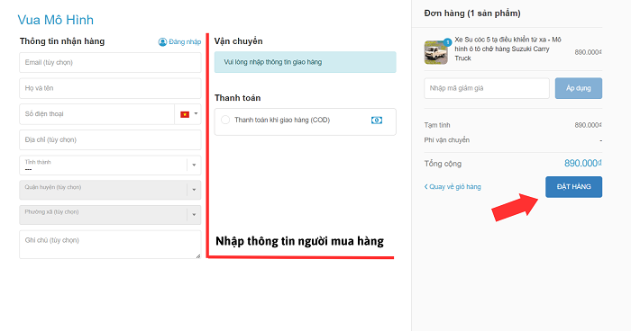 Tại đây, cần điền thông tin người mua hàng để thuận lợi cho việc giao hàng. Ngoài ra, màn hình cũng hiển thị tất cả thông tin đơn hàng của bạn bao gồm cả chi phí vận chuyển. Cuối cùng, xem lại toàn bộ các mặt hàng cũng như số lượng hàng có trong giỏ hàng của mình và tiến hành Đặt hàng. Nhân viên của Vua mô hình sẽ liên hệ trực tiếp bằng số điện thoại và xác nhận đơn hàng và địa chỉ của bạn để thuận lợi cho việc giao, nhận hàng.