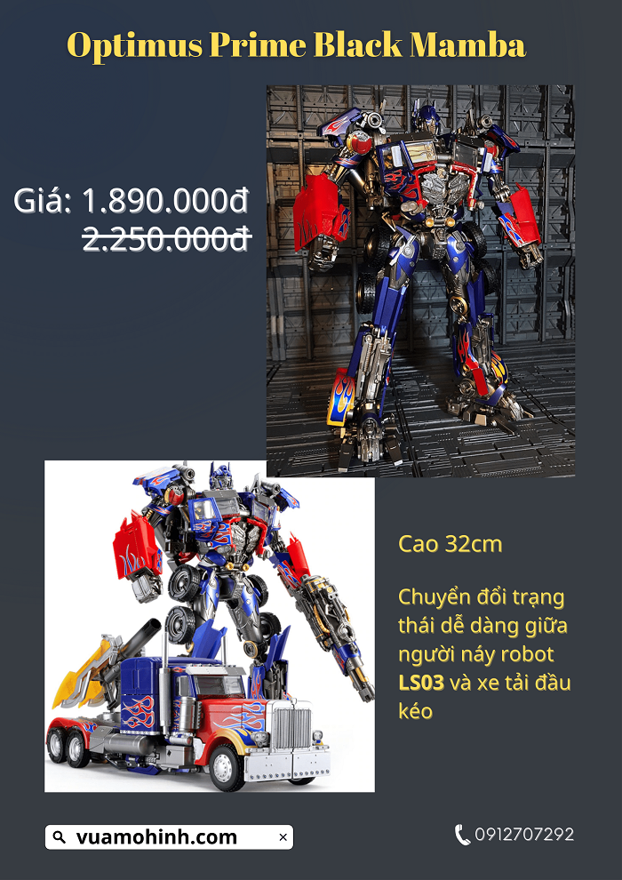 Mô hình tiếp theo phải kể đến LS-03 Optimus Prime Transformers Black Mamba - Mô hình người máy robot biến hình xe tải đầu kéo cao 32cm Oversized. Mô hình Transformers Optimus Prime được lấy cảm hứng từ nhân vật cùng tên trong bộ Phim Transformer. Robot Optimus Prime mô hình Transformers là thủ lĩnh tối cao của phe Autobot nhằm chống lại phe Decepticon đang âm mưu xâm chiếm trái đất. Robot Optimus Prime mô hình Transformers có vẻ ngoài khi biến hình là chiếc xe tải đầu kéo màu xanh đỏ pha một chút sọc xanh.