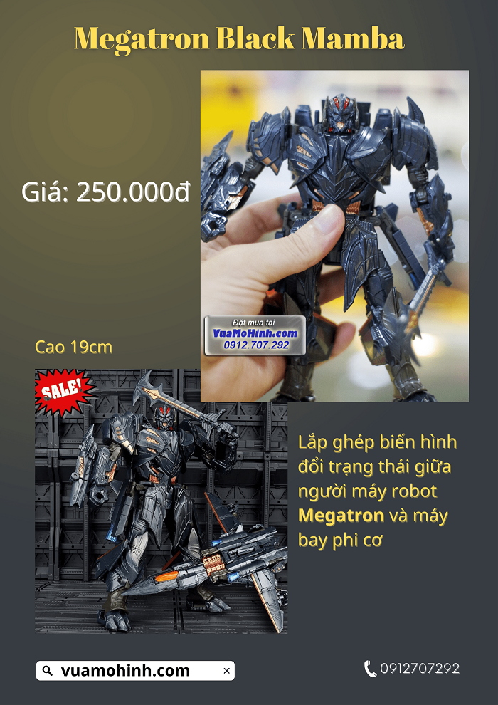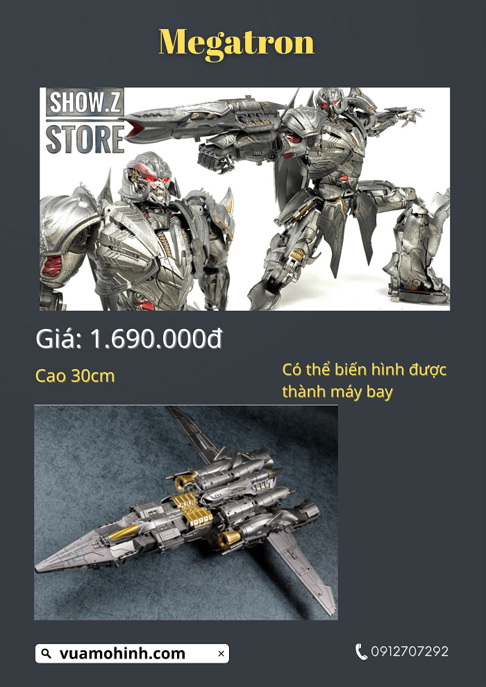 Mô hình Transformers Megatron: Megatron Transformers là nhân vật đầu tiên không thể thiếu trong bộ sưu tập về phe Decepticon, Megatron có vị trí thủ lĩnh toàn phe, đồng thời là đối thủ số 1 của các chiến binh Autobot. Mô hình Transformer Megatron hiện nay trên thị trường thường được sản xuất phác họa dưới nhiều hình thức biến hình như khủng long bay, ô tô, tàu vũ trụ… đa dạng dựa trên cấu tạo linh hoạt, giúp người chơi có thể dễ dàng tháo rời, biến đổi linh hoạt.