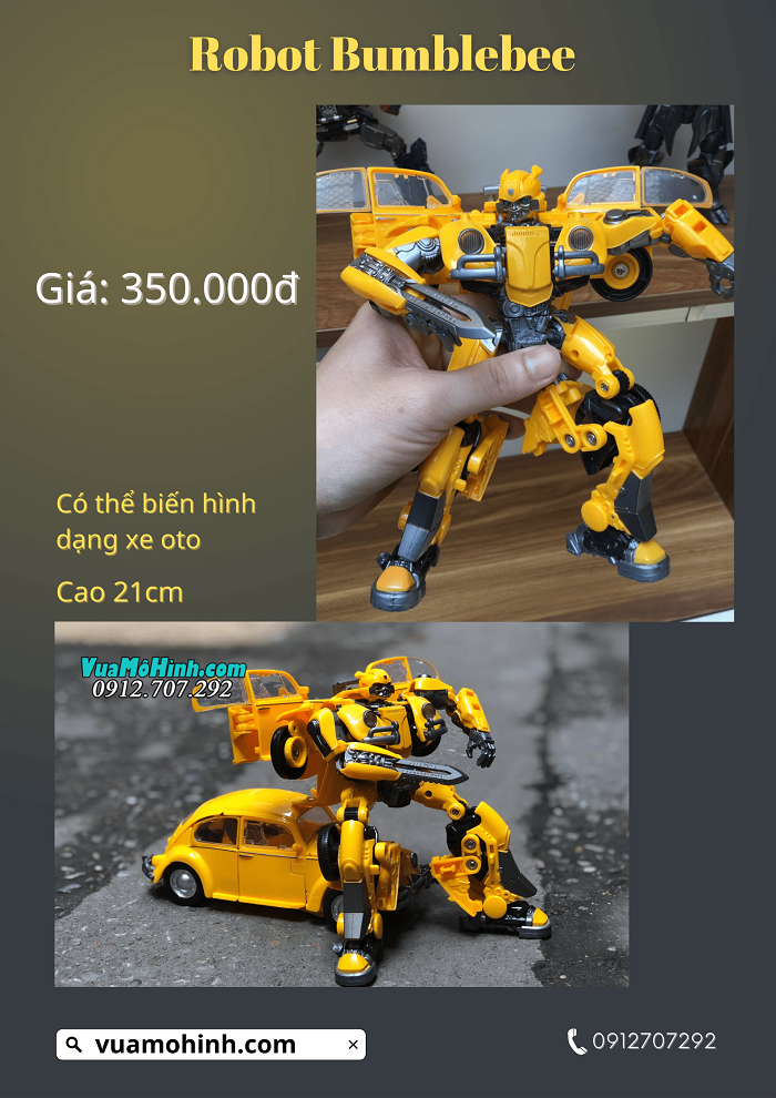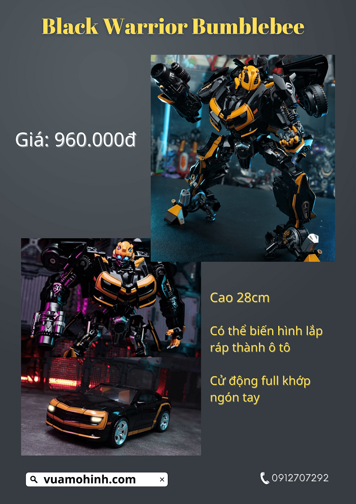 Mô hình Transformers tiếp theo phải kể đến: BB-02 Transformers Bumblebee Black Mamba - Mô hình người máy biến hình robot cao 28cm Oversized. Mô hình Robot Bumblebee mô hình Transformers một trong những nhân vật chính của bộ phim nổi tiếng "Người Máy Biến Hình". BB-02 có thể biến hình thành một siêu xe, với thiết kế tỉ mỉ và cực chân thật giống trong phim đây là mô hình thật sự đáng mua trong tầm giá dưới 1 triệu.