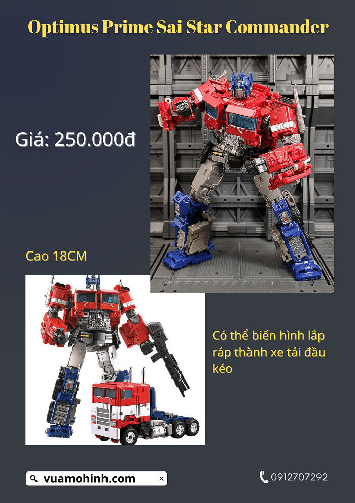 Đầu tiên trong danh sách Mô hình Transformers là: Mô hình Robot YS-04 SS38KO Transformers Optimus Prime Sai Star Commander biến hình robot người máy xe oto tải đầu kéo cao 18cm. Đây là mô hình thu nhỏ của Thủ lĩnh Optimus Prime mô hình Transformers, rất phù hợp cho những bạn nhỏ mà giá tiền lại vô cùng hợp lí ở thời điểm hiện tại.