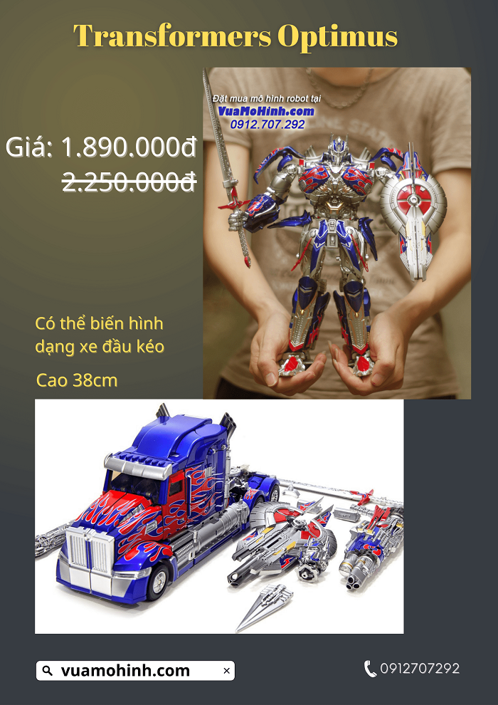 Mô hình Transformers Optimus Prime: Optimus Prime mô hình Transformer được biết đến là thủ lĩnh của phe Autobot, không chỉ nổi tiếng là nhà quân sự thiên tài, Optimus Prime còn có biệt tài biến bình từ robot sang xe tải và ngược lại. Hiện nay, các mẫu đồ chơi robot biến hình mô hình Transformers Optimus Prime mặc dù sản xuất bởi thương hiệu nào, nhưng vẫn giữ được những yếu tố cốt lõi của hình tượng mô hình Transformers Optimus Prime trong phim về hình dáng cùng khả năng biến hình siêu đỉnh thông qua một vài thao tác lắp ghép chuyển đổi hình dáng.