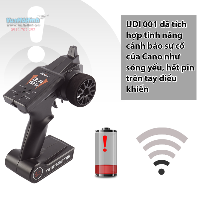 - Báo động hết pin, mất sóng: Đa phần Người chơi cano hiện nay gặp phải vấn đề lớn là không biết khi nào Cano hết pin hoặc ra ngoài tầm điều khiển. Can UDI 001 đã được tích hợp tính năng báo động khi cano chuẩn bị hết pin, mất sóng ngay trên tay điều khiển.