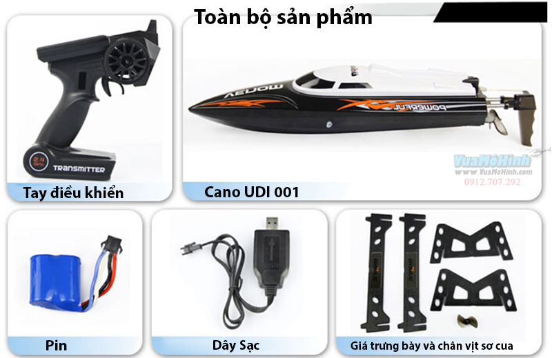 - Toàn bộ sản phẩm gồm: 1 Cano UDI 001, 1 pin 7.4V 600mAh, 1 tay điều khiển, 2 chân vịt sơ cua, 1 giá trưng bày, 1 sạc pin, 1 sách hướng dẫn sử dụng cano UDI 001 bằng tiếng anh.